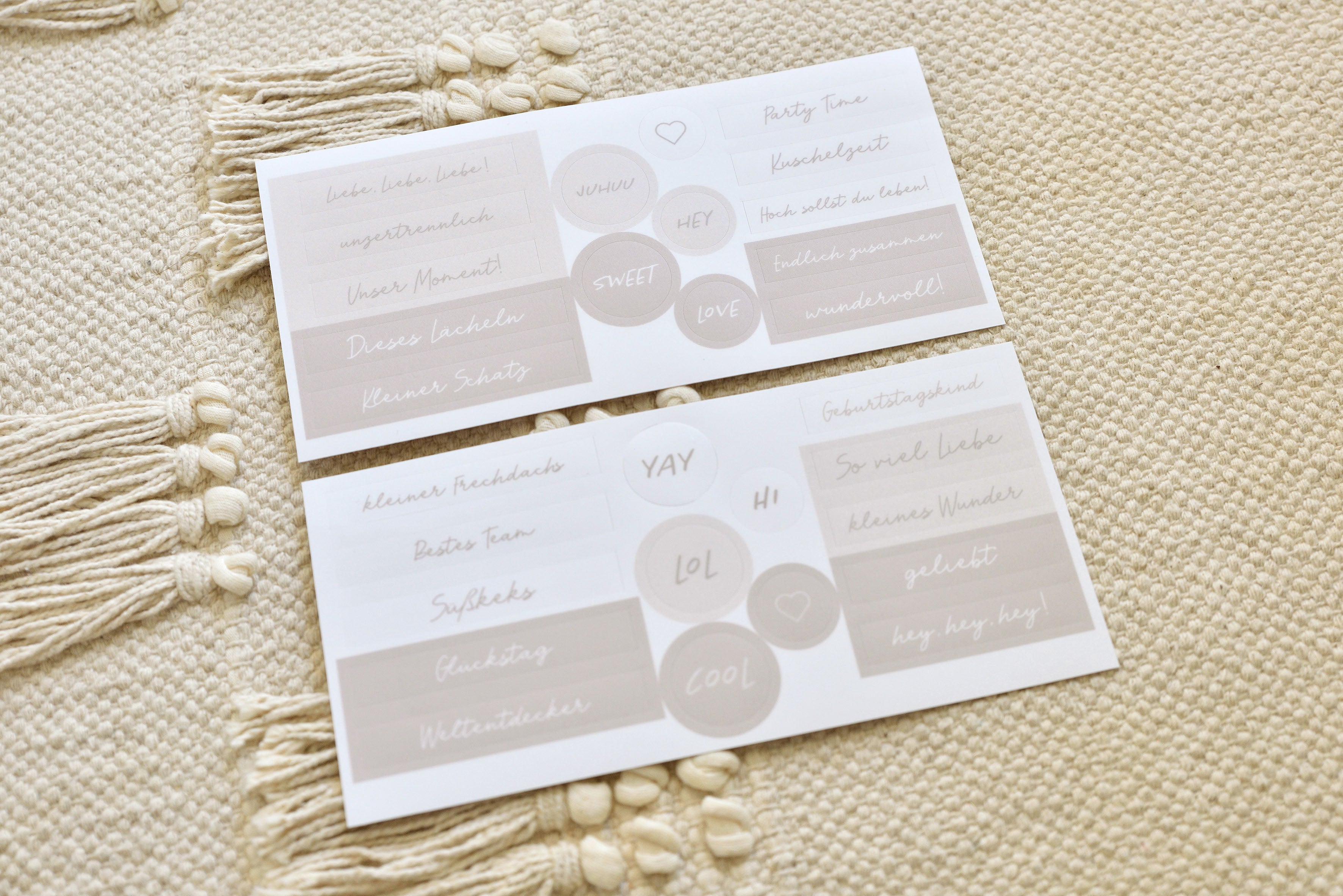 Du kannst dein Babybuch „Dein kleines Leben“ mit diesem Aufklebern ergänzen. Klebe eine süße Botschaft neben die Fotos deines Kindes. Die Motive und Worte sind auf die Themen im Meilensteinbuch abgestimmt. Du erhältst zwei unterschiedliche Stickerbögen mit insgesamt 30 Aufklebern. Das Farbschema ist genau wie das im Buch in Naturtönen gehalten.