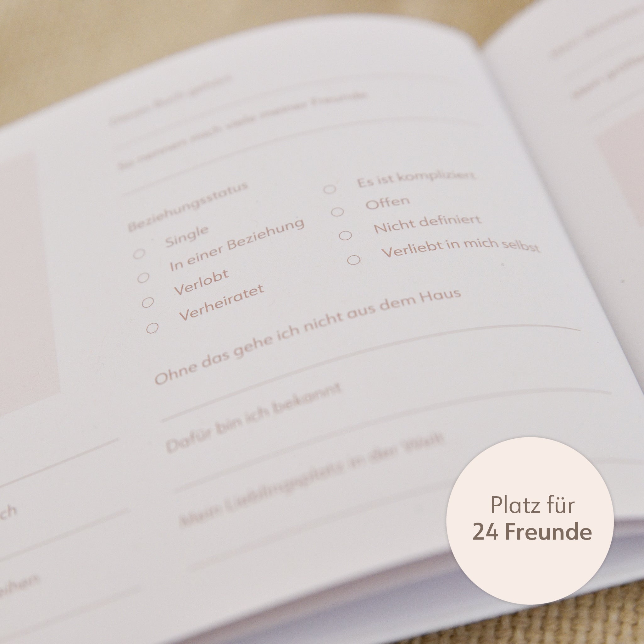 Die Doppelseiten sind so gestaltet, dass deine Freundinnen viel mehr ausfüllen als Standardfragen: Sie verraten witzige Eigenheiten, kleine Geheimnisse, interessante Fakten über sich selbst und verfassen liebevolle Worte für dich.