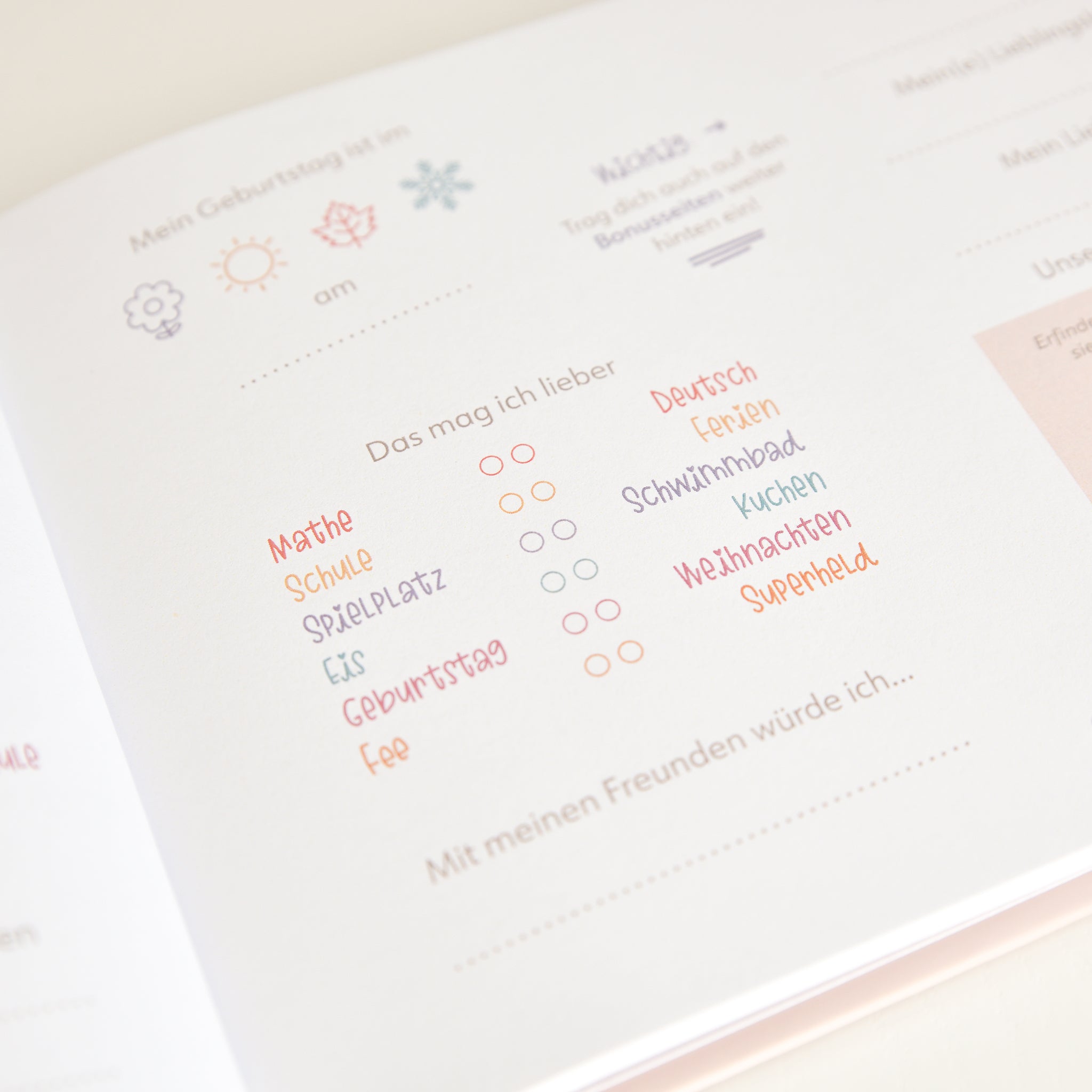 Es können Lieblingsbücher eingetragen, Songs für die nächste Klassenparty gesammelt und Fotos eingeklebt werden – ein bunter Mix aus Erinnerung, Kreativität und echter Freundschaft.