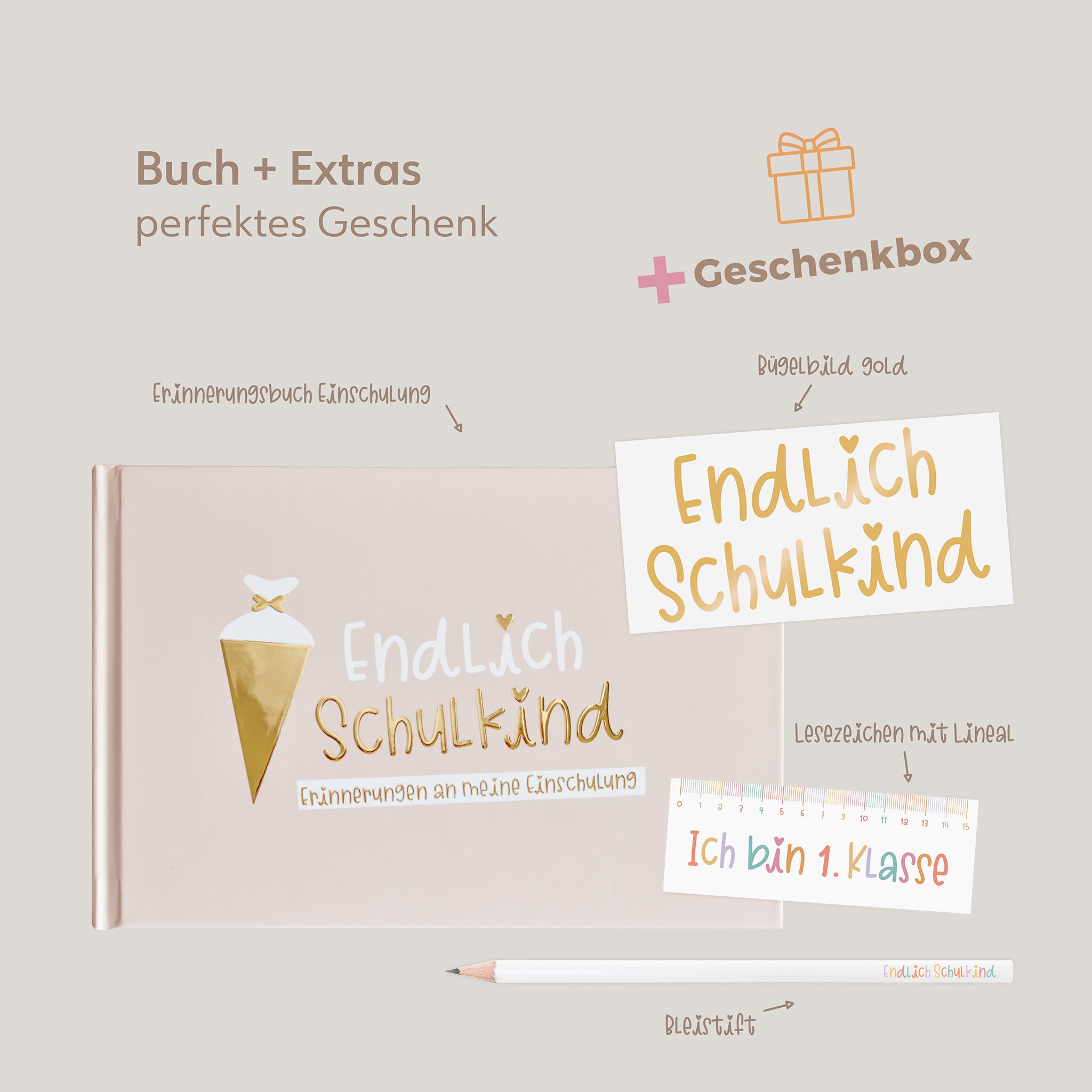 Buch mit Extras beinhaltet: Einschulungsbuch, Bügelbild, Lesezeichen und Bleistift