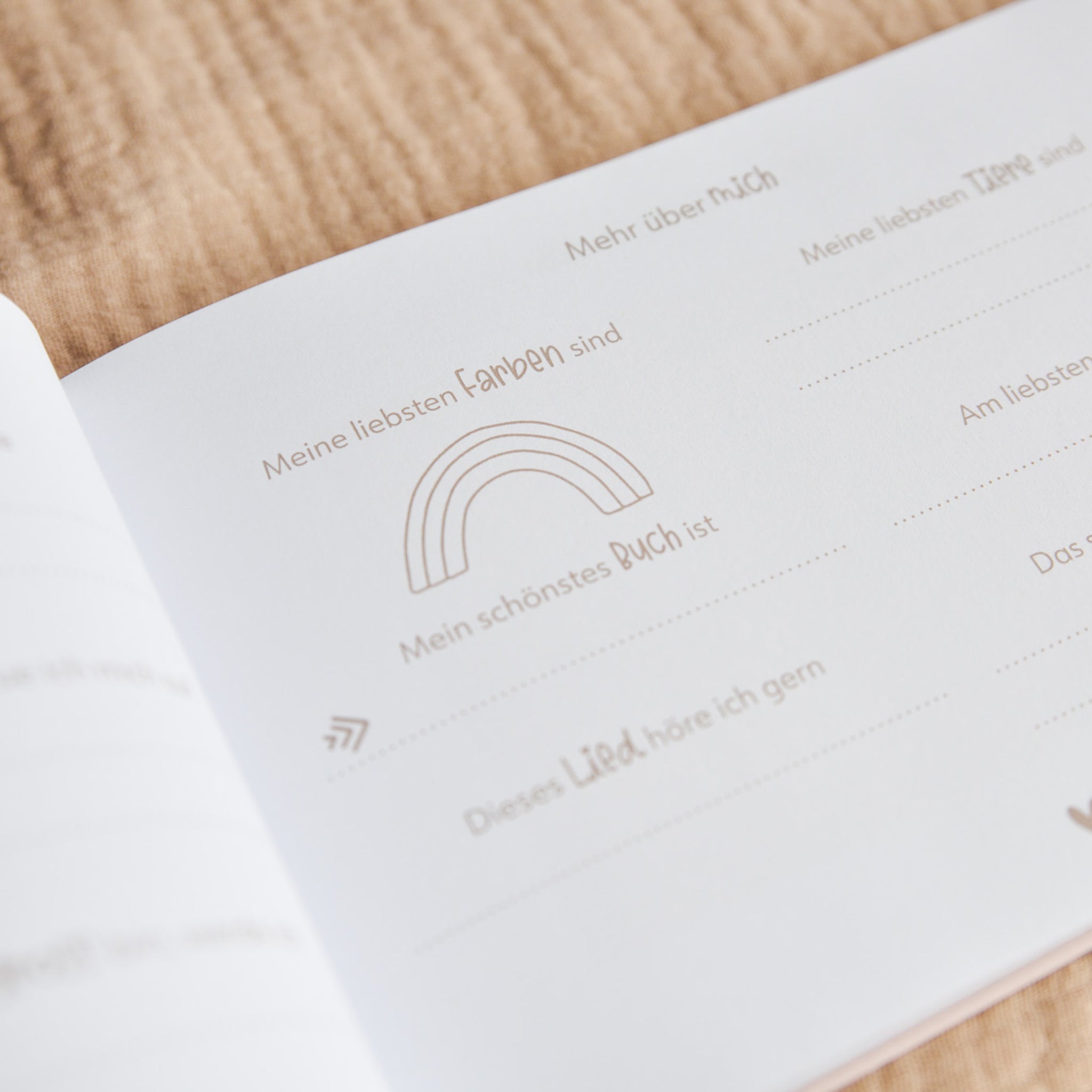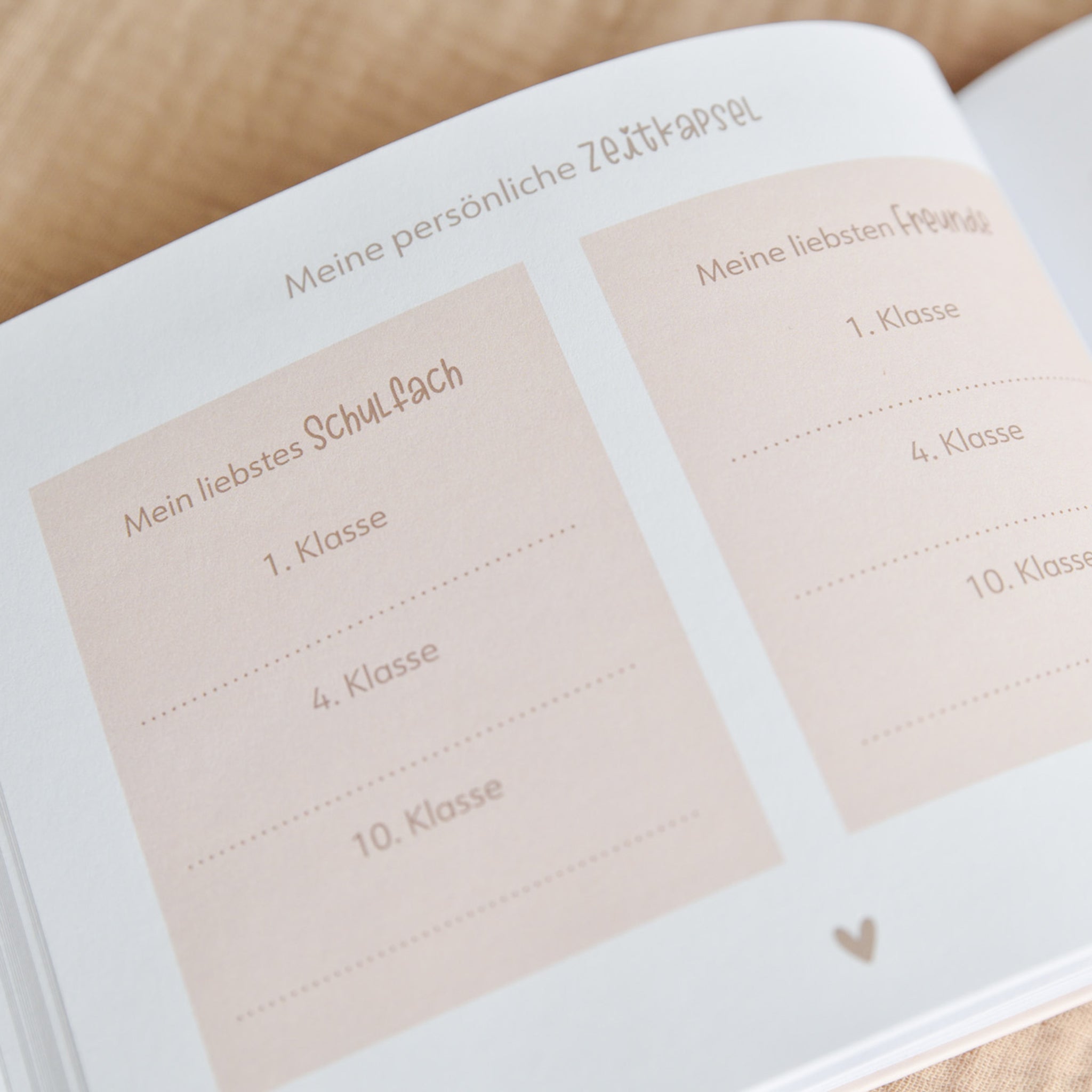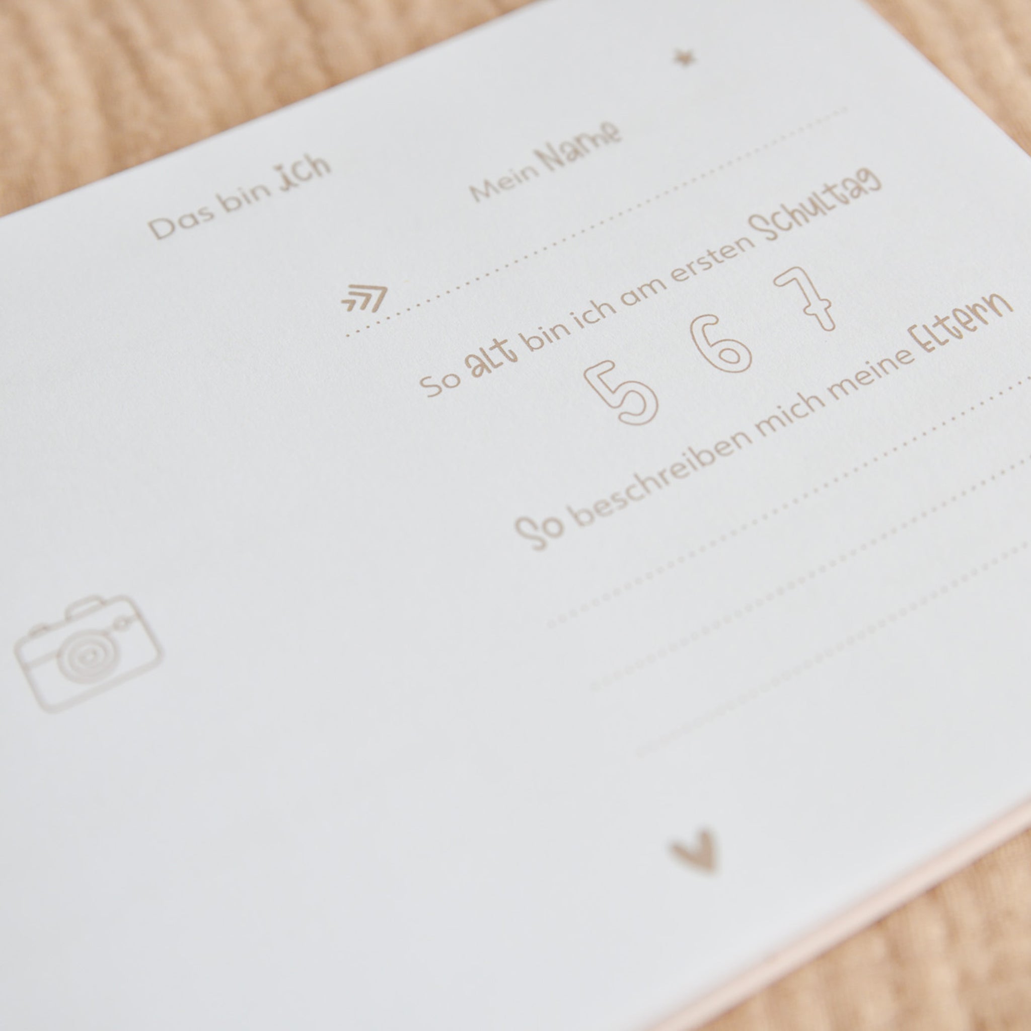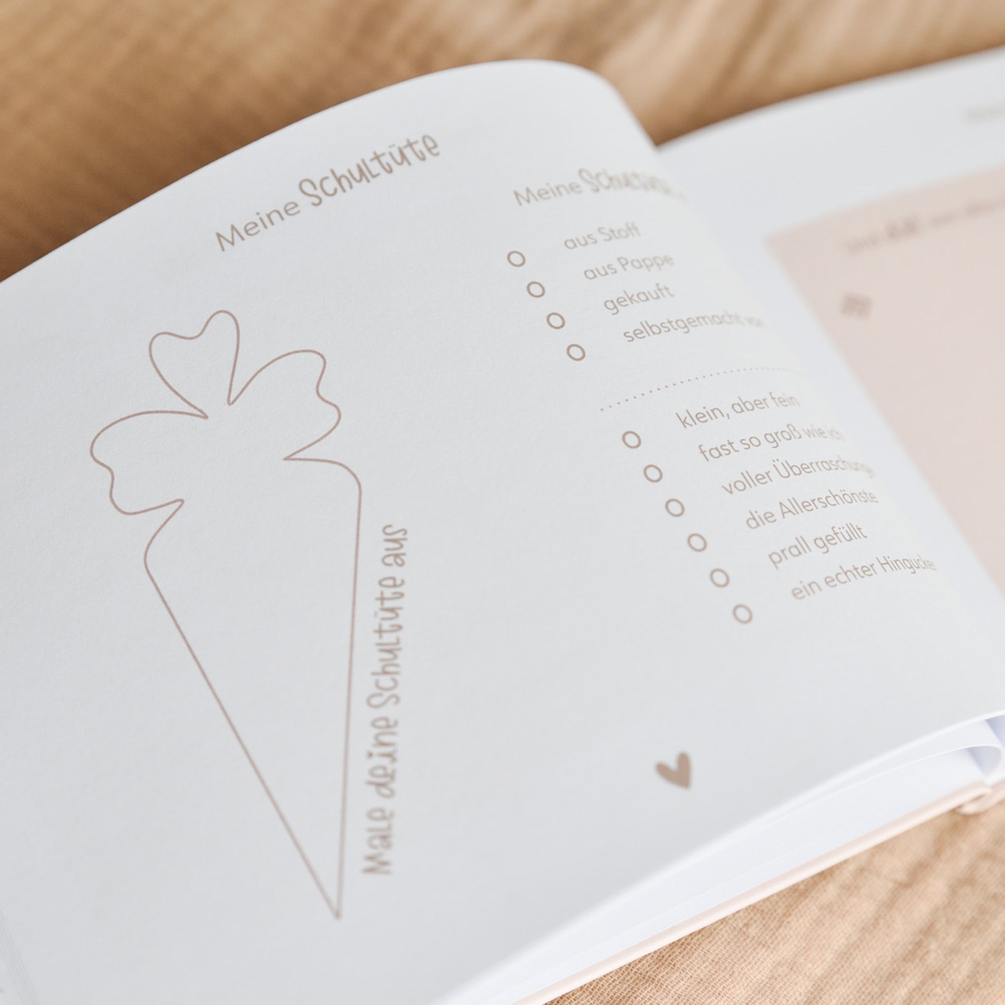 Das Schulkind selbst kann sich aktiv beim Ausfüllen des Buches beteiligen, in dem es z.B. seine Schultüte ausmalt oder erste Worte in seiner Handschrift verewigt.